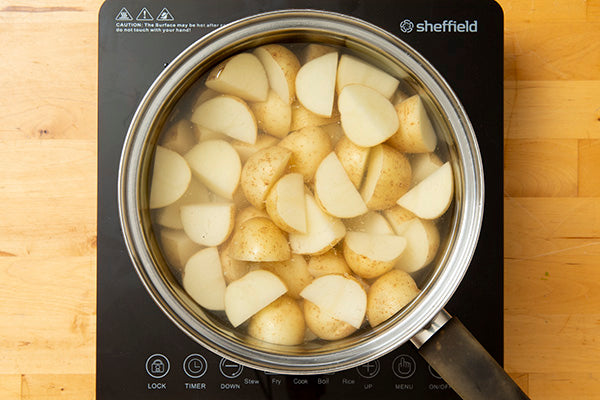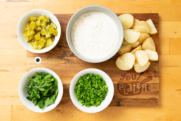 A modern twist on the traditional (and some say boring) potato salad. Local chat potato you cook and combine with the classic sour cream, a little parsley, some mayonnaise and bacon.