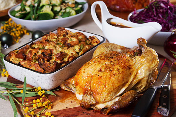 A traditional roast chicken with a delectable cranberry thyme stuffing and gravy. Suitable for 6 people.